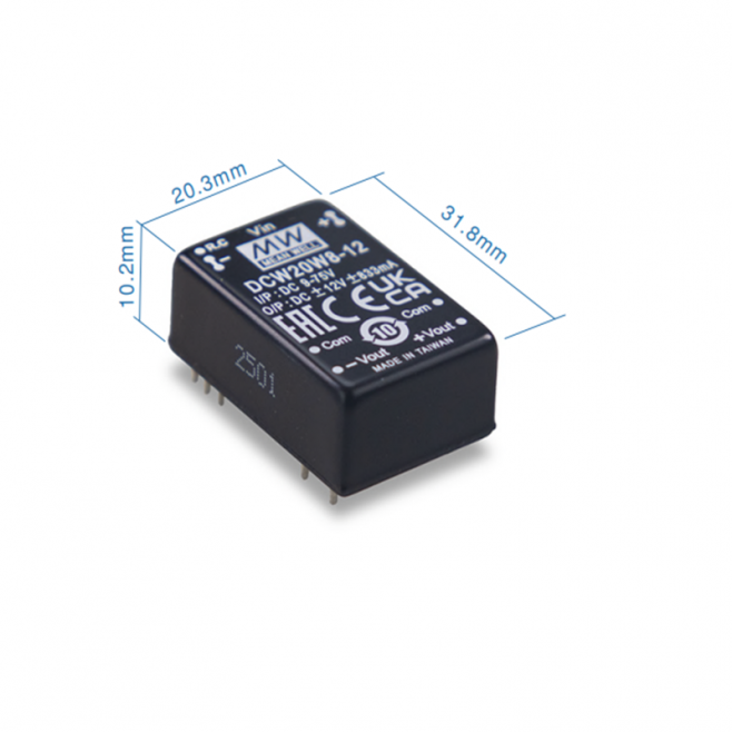 DCW20W8-15: DC-DC měnič Mean Well ±15V, výkon 20W, vstup 9–75V, účinnost 87 %, ochrany, DIP24, spolehlivý pro průmysl, laboratorní i telekomunikační použití.