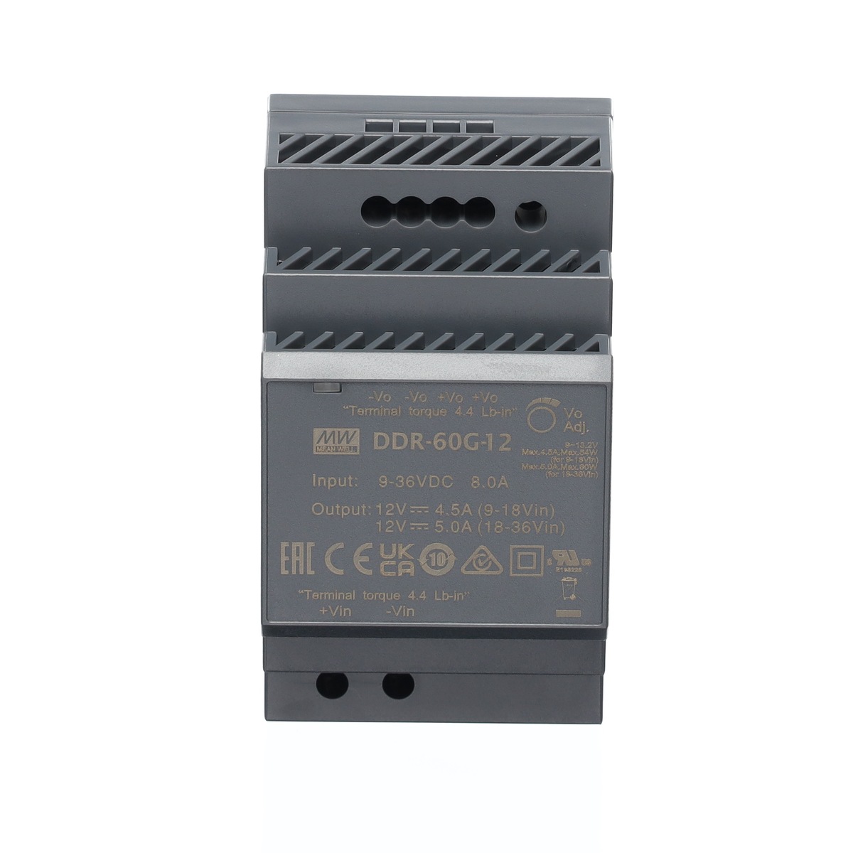 DC-DC měnič Mean Well DDR-60G-12, 12V/5A, 60W, DIN, výjimečná účinnost, ochrany, kompaktní rozměr – ideální pro průmysl a automatizaci.