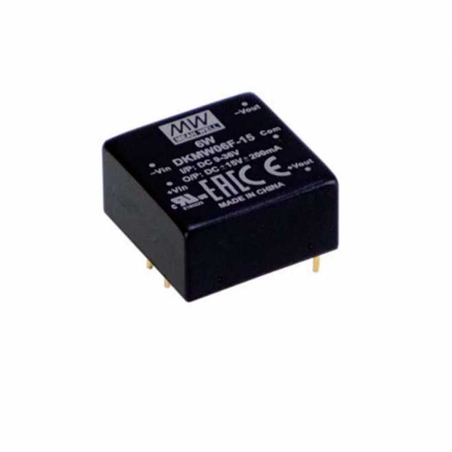 DC-DC měnič Mean Well DKMW06G-5, ±5V/600mA, 6W, účinnost 86 %, kompaktní pouzdro, izolace 1,5kV, spolehlivé řešení pro průmyslové aplikace.