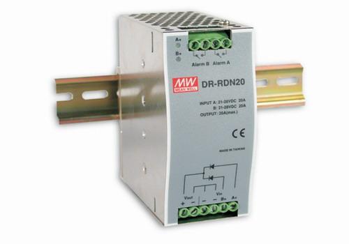Redundanční modul Mean Well DR-RDN20 pro 24V systémy, 20A, DIN lišta, EMC třída B, reléový výstup, LED indikace, spolehlivost pro průmyslové aplikace.