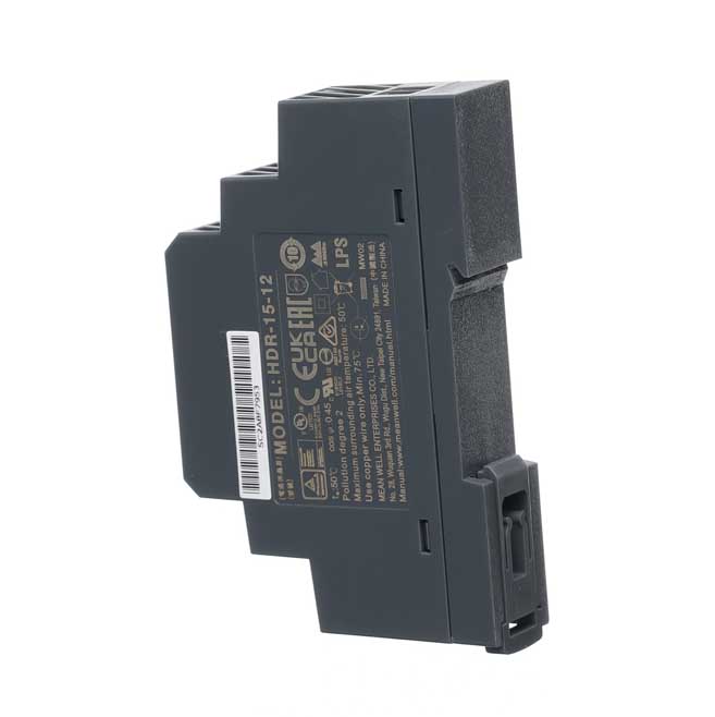 Spínaný zdroj Mean Well HDR-15-12 – 15W, 12V, úzký profil na DIN lištu, vysoká účinnost, ochrany, certifikace. Ideální pro automatizaci a průmysl.