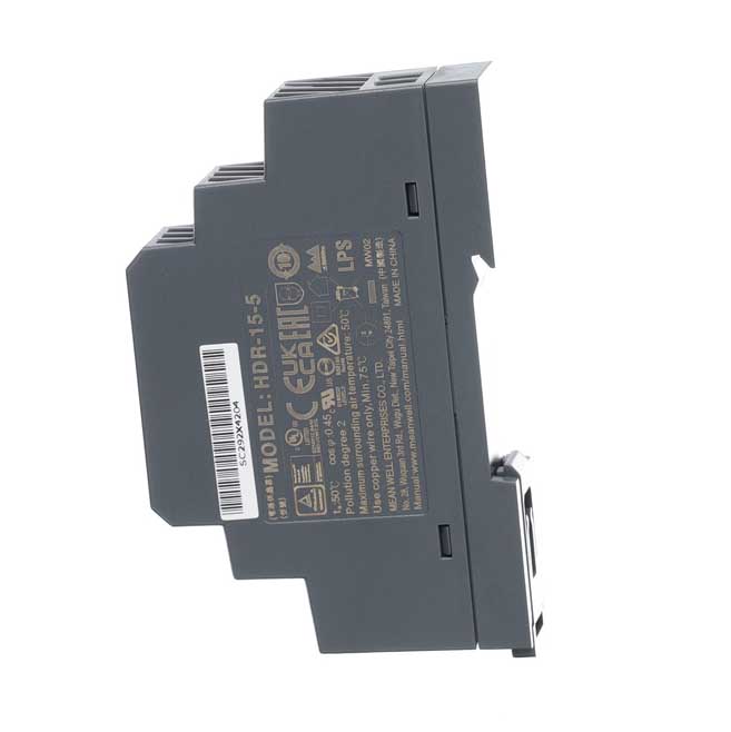 Mean Well HDR-15-5 – ultra tenký napájecí zdroj 5V/2,4A na DIN lištu, vysoká účinnost, certifikace, ochrany proti přetížení a dlouhá životnost.