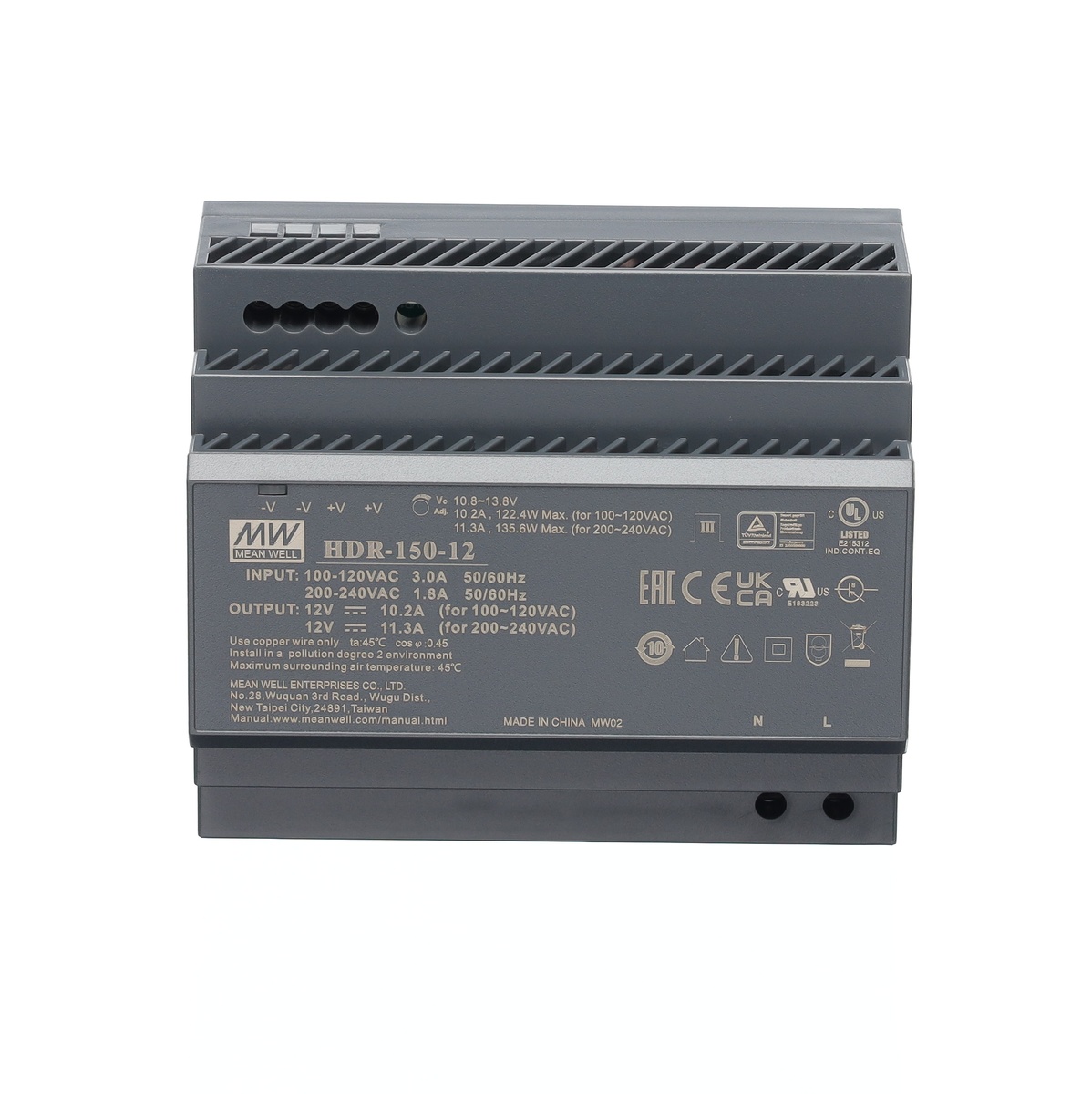 Ultra tenký 12V/10A zdroj Mean Well HDR-150-12 na DIN lištu – výkon 120W, účinnost 89 %, ochrany a certifikace. Ideální pro průmysl i LED.