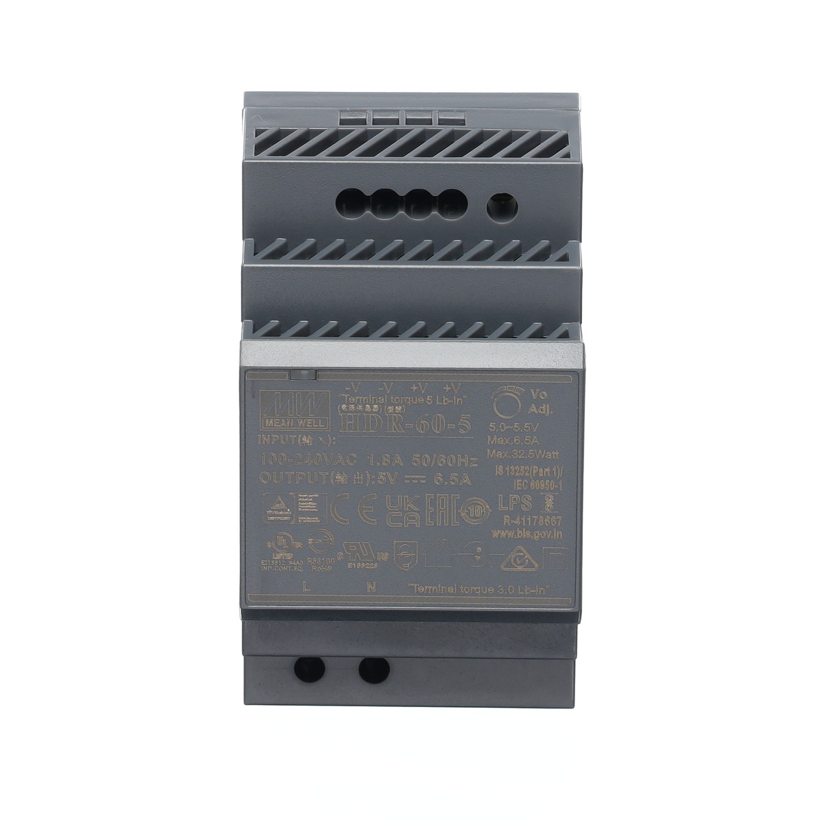 Mean Well HDR-60-5: spínaný napájecí zdroj na DIN lištu, 5V/6,5A, 54W, vstup 85–264VAC, vysoká účinnost, ochrany, kompaktní provedení, oficiální distribuce.