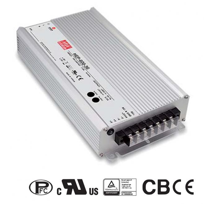 Odolný síťový spínaný zdroj Mean Well HEP-600-42, 42 V/14,3 A, výkon 600,6 W, účinnost 96 %. Široký rozsah vstupu, průmyslové certifikace, robustní provedení.