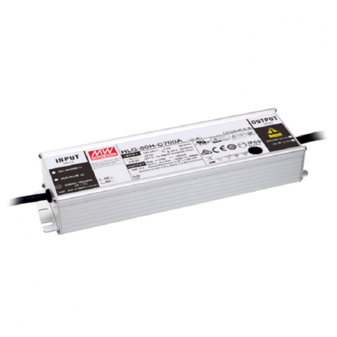 Voděodolný LED zdroj Mean Well HLG-80H-C350D, 89,95W, 350mA, vysoká účinnost 91,5 %, ochrany, certifikace, vstup 90–305VAC. Perfektní volba pro LED osvětlení.