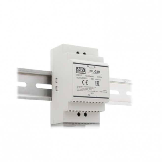 MEAN WELL ICL-28R: omezovač náběhového proudu 28A, pro DIN lištu, kapacitní zátěž 6000 μF, chrání jističe, EMC a LVD certifikace, pro průmysl.