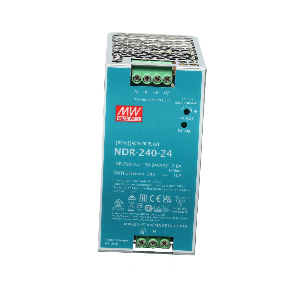 Průmyslový zdroj Mean Well NDR-240-24, 24V/10A, výkonný, spolehlivý a certifikovaný, kompaktní provedení na DIN lištu. Rychlé dodání a technická podpora.