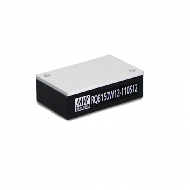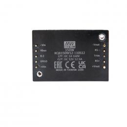 Kompaktní DC-DC měnič Mean Well RQB150W12-110S12: 14–160VDC, výstup 12V/12,5A, 150W, vysoká účinnost, certifikace EN50155, ochrany, spolehlivost.