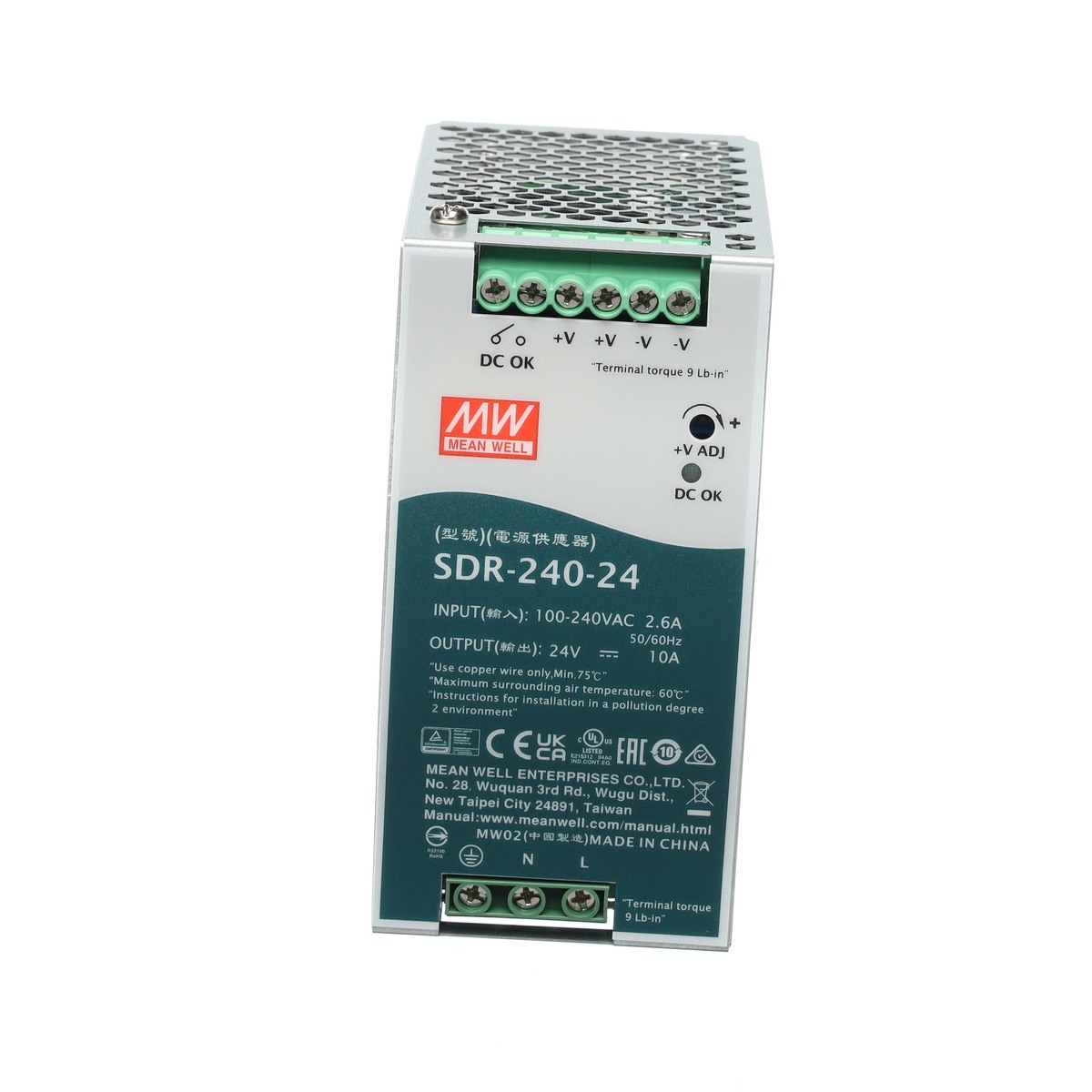 Průmyslový spínaný zdroj Mean Well SDR-240-24 na DIN lištu s výkonem 240 W, výstupem 24V/10A, PFC a účinností 94 %. Ochrany a certifikace.