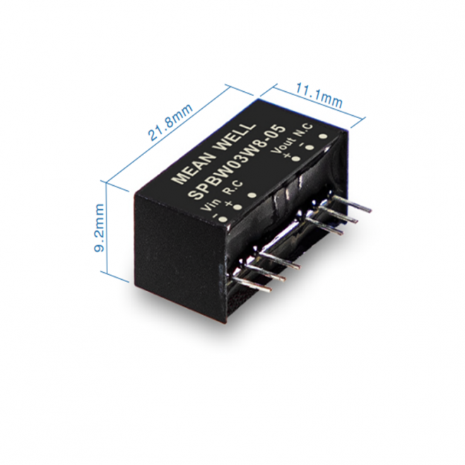 Kompaktní DC-DC měnič Mean Well SPBW03W8-05 (5V/600mA, 3W, 84 % účinnost, vstup 9–75V) s ochranou proti zkratu, přetížení a EMC certifikací.