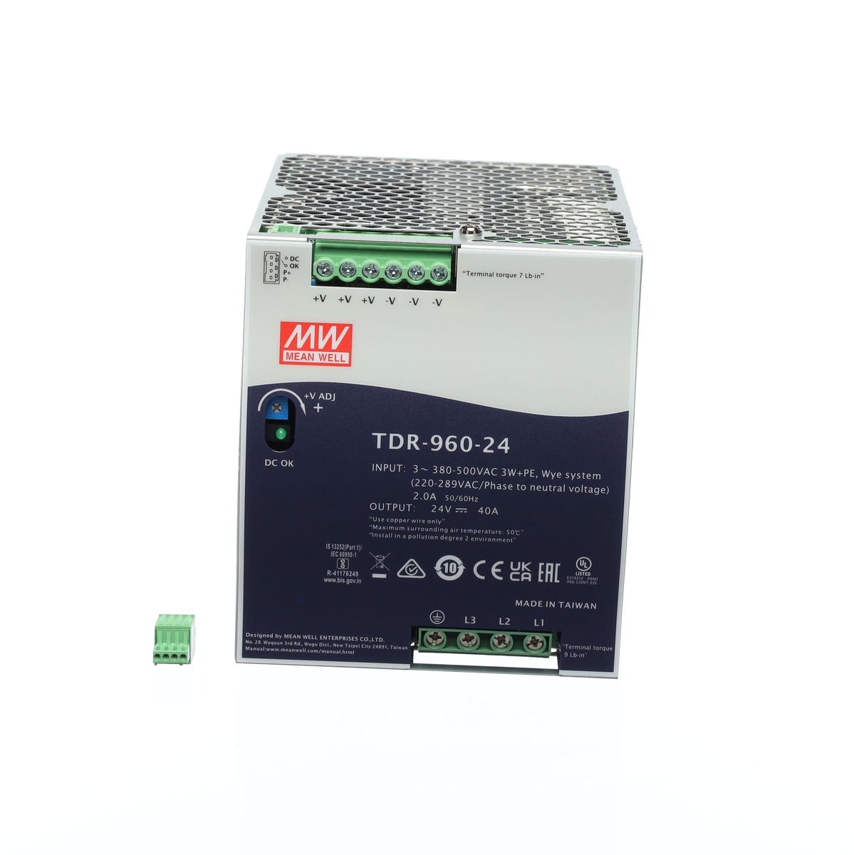 Zdroj Mean Well TDR-960-24 – průmyslový DIN zdroj 960W/24V, 40A, PFC, široké vstupní napětí, účinnost až 94,5 %. Spolehlivost a ochrany pro náročné aplikace.