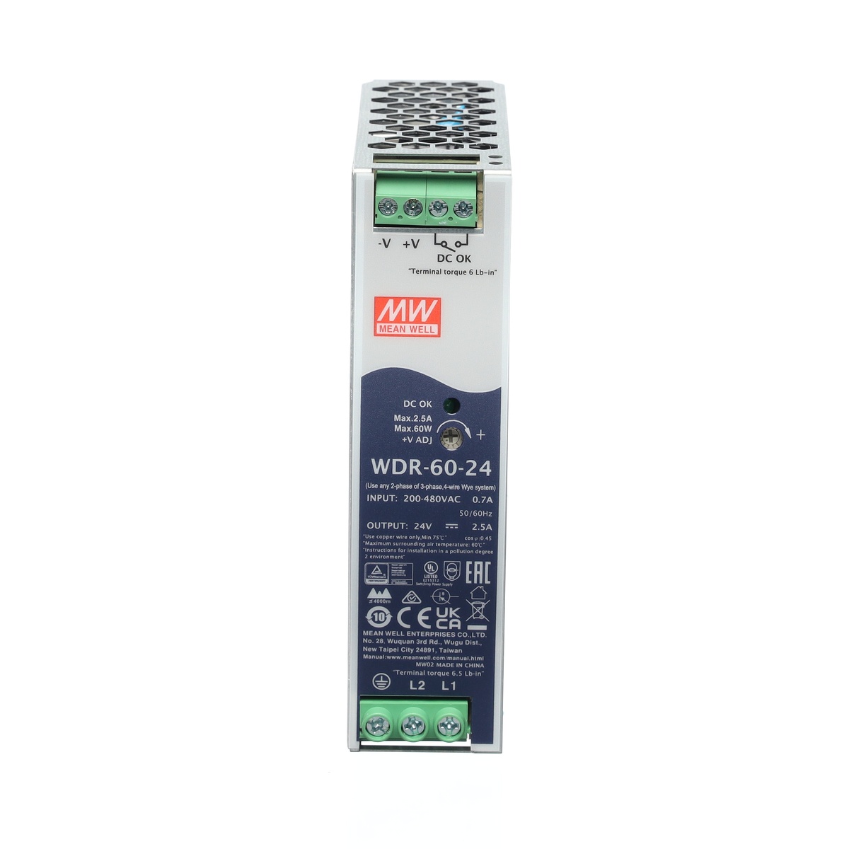 MEAN WELL WDR-60-24 – průmyslový napájecí zdroj 24V, 2.5A, 60W na DIN lištu, vysoká účinnost, rozšířené ochrany, DC OK relé.