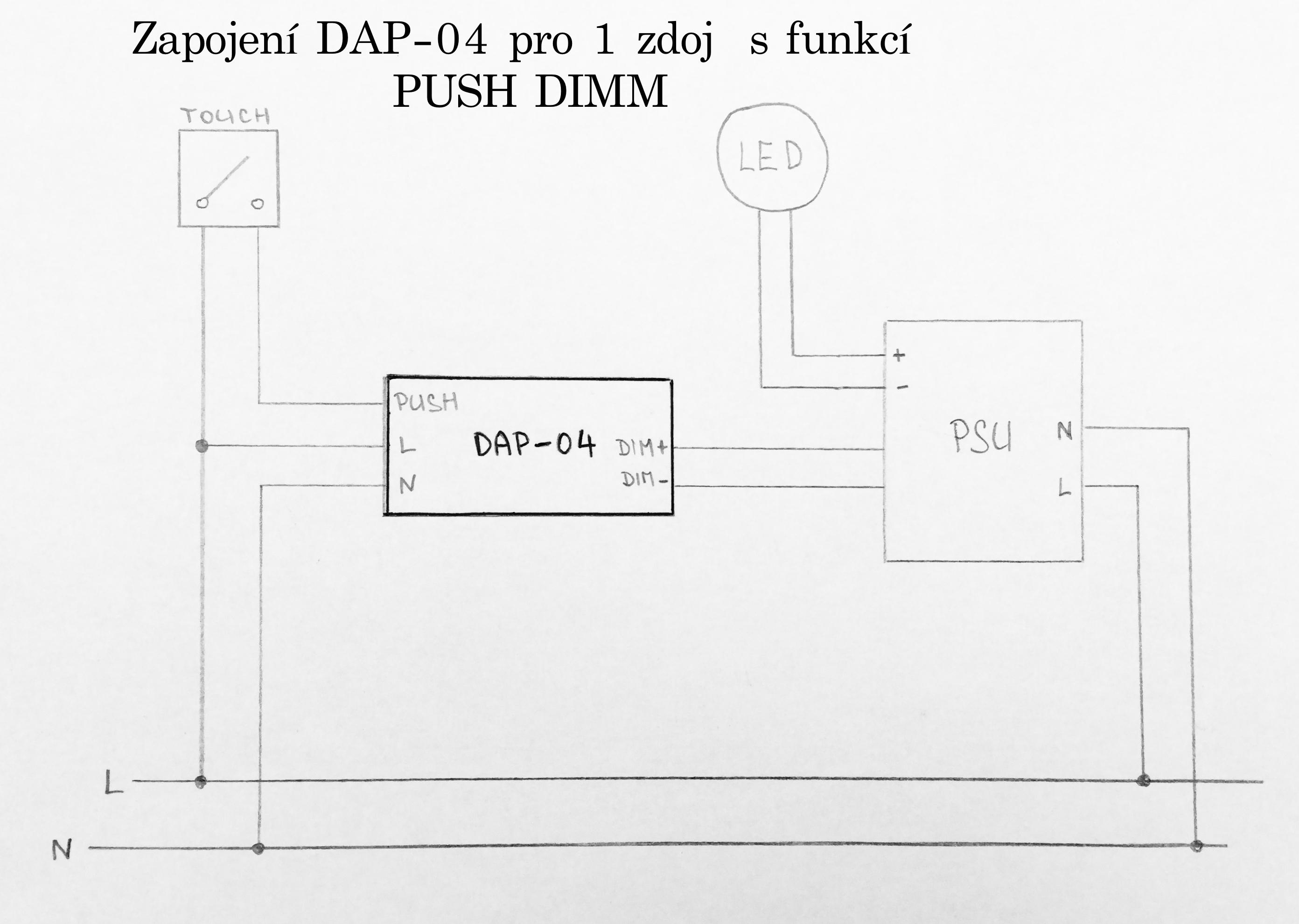 Zdroje s PWM regulací lze stmívat pomocí obyčejného tlačítka bez aretace. Musíte však použít signálový převodník DAP-04, jelikož má funkci PUSH DIMM.
