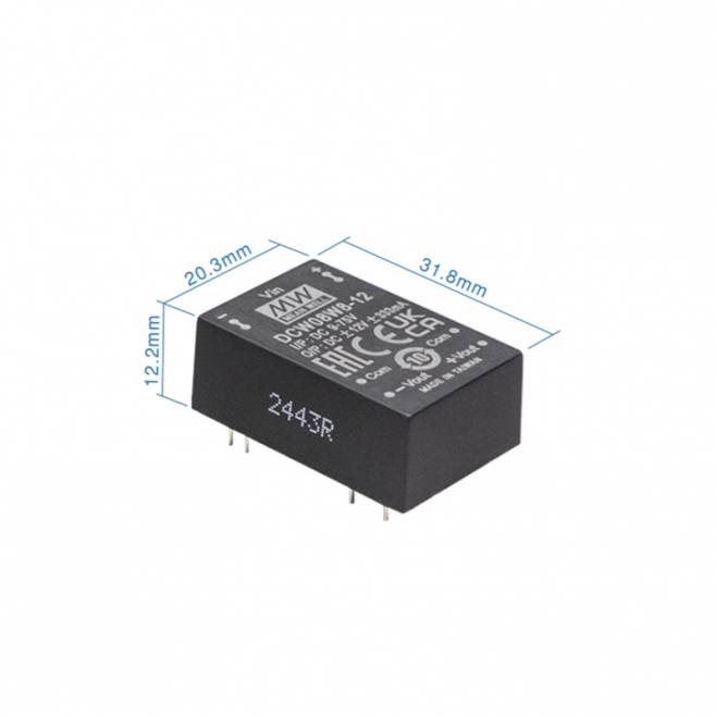 Kompaktní DC-DC měnič Mean Well DCW08W8-12 s výstupem ±12V, výkonem 8W, účinností 86 % a certifikací EMC. Ideální pro průmysl a automatizaci.