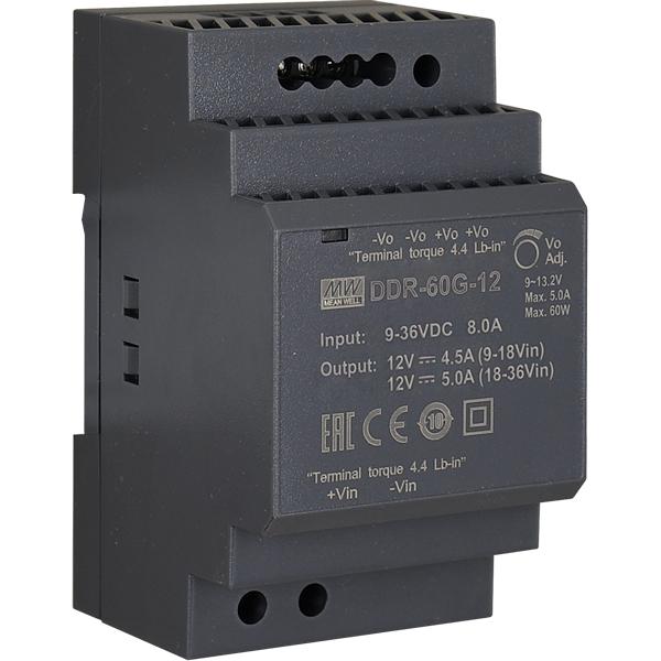 Špičkový DC-DC zdroj Mean Well DDR-60G-24, 24V/2,5A, 60W, účinnost 91 %, montáž na DIN lištu, průmyslové použití, plná ochrana, široký vstup.