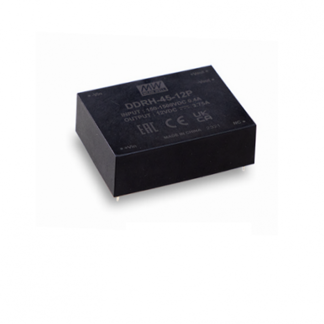 DC/DC zdroj Mean Well DDRH-45-48P: 48V / 0,938A / 45W, ultraširoký vstup 150–1500V DC, účinnost 85 %, kompletní ochrany, kompaktní na PCB.