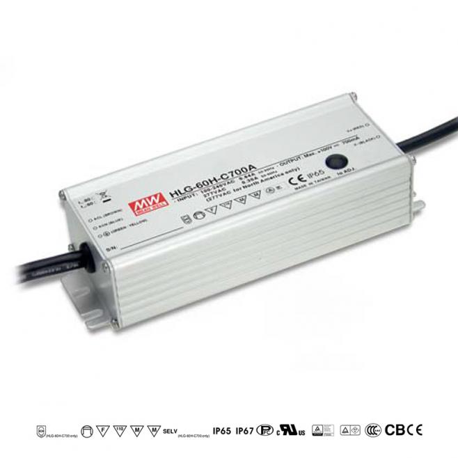 HLG-60H-C350A: Spínaný LED zdroj Mean Well 70W, 350mA, vysoká účinnost, IP65/67, univerzální vstup, ochrany, certifikace. Ideální pro LED osvětlení.