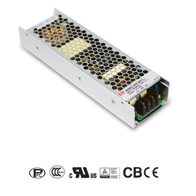 Spínaný zdroj Mean Well HSP-200-5, 5V/40A, výkon 200W, účinnost 88,5 %, ochrany, certifikace, kompaktní rozměry. Pro průmysl, LED a automatizaci.
