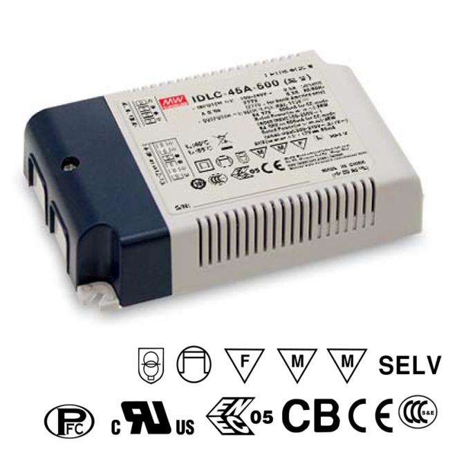 LED zdroj Mean Well IDLC-45A-500 – 500mA, 45W, vysoká účinnost, ochrany, pomocný výstup 12V. Spolehlivý napájecí zdroj pro LED aplikace.