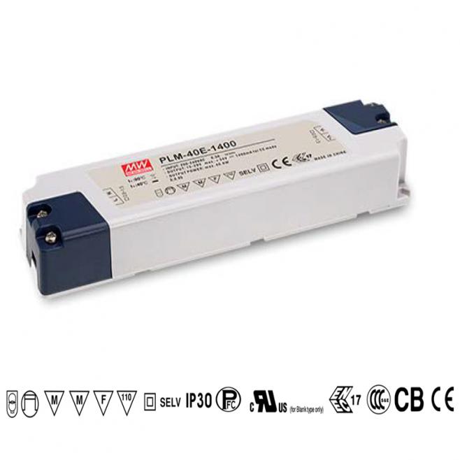 LED zdroj Mean Well PLM-40-1750: 1,75A, 12–23V, 40,25W, vysoká účinnost, kompaktní rozměry, ochrana proti zkratu a přehřátí, EMC a bezpečnostní certifikace.