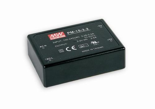 Spolehlivý napájecí zdroj 15V/1A Mean Well PM-15-15, účinnost 81 %, kompaktní, s ochranami a lékařskou certifikací. Pro průmysl i zdravotnictví.