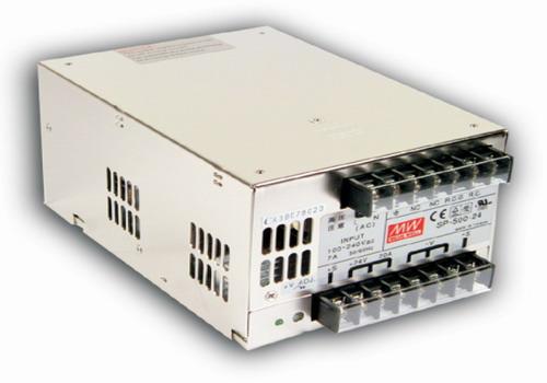 Mean Well SP-500-13.5 – spolehlivý průmyslový zdroj 13.5V/36A/486W, aktivní PFC, certifikace, ochrany, chlazení DC ventilátorem.