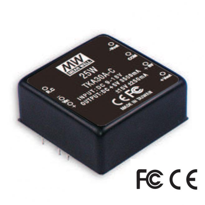 DC-DC měnič Mean Well TKA30C-C: 25W, vstup 36–72 VDC, výstup +5V ±2V a ±5V, účinnost 82 %, průmyslové provedení, ochrany a EMC.