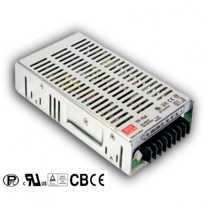 Spínaný zdroj Mean Well TP-7503, 3.3V/9A, 12V/8A, 5V/0.3A, 75W, PFC, ochrany, vysoce spolehlivý, certifikace UL a TÜV, kompaktní rozměr 179x99x33mm.