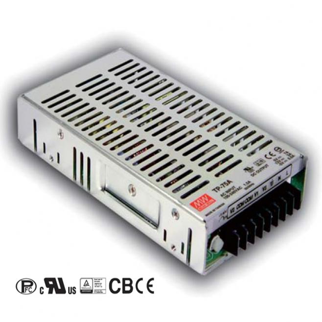 Spínaný napájecí zdroj Mean Well TP-75D – 75,8W, 5V, 24V, 12V, PFC, široké vstupní napětí, kompaktní a odolný. Certifikace UL, TÜV, EMC.