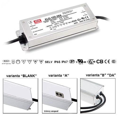 Napájecí zdroj Mean Well ELG-100-48A – 48V/2A, 96W, účinnost 90 %, krytí IP65/IP67, ochrany a certifikace, ideální pro LED a průmyslové aplikace.