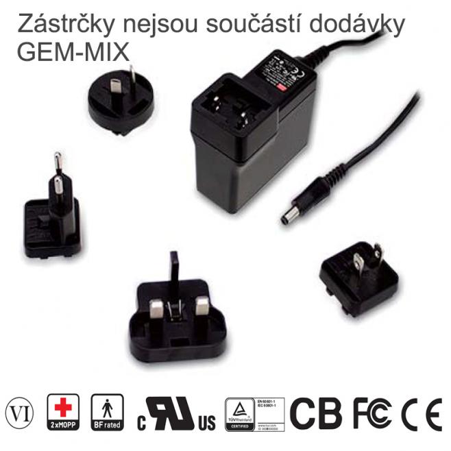Lékařský adaptér Mean Well GEM30I15-P1J: 15V/2A, výkon 30W, vysoká účinnost, globální vstup, ochrany, výměnné konektory. Certifikace pro zdravotnická zařízení.