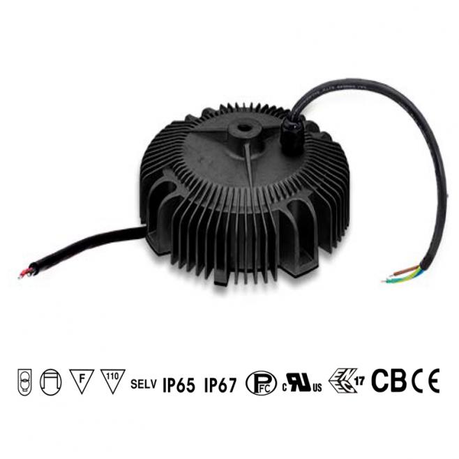 Průmyslový LED zdroj Mean Well HBG-240-48, 240W/48V, IP65/IP67, vysoká účinnost 93,5 %, ochrany proti přetížení, přepětí i přehřátí. Certifikace UL, ENEC.